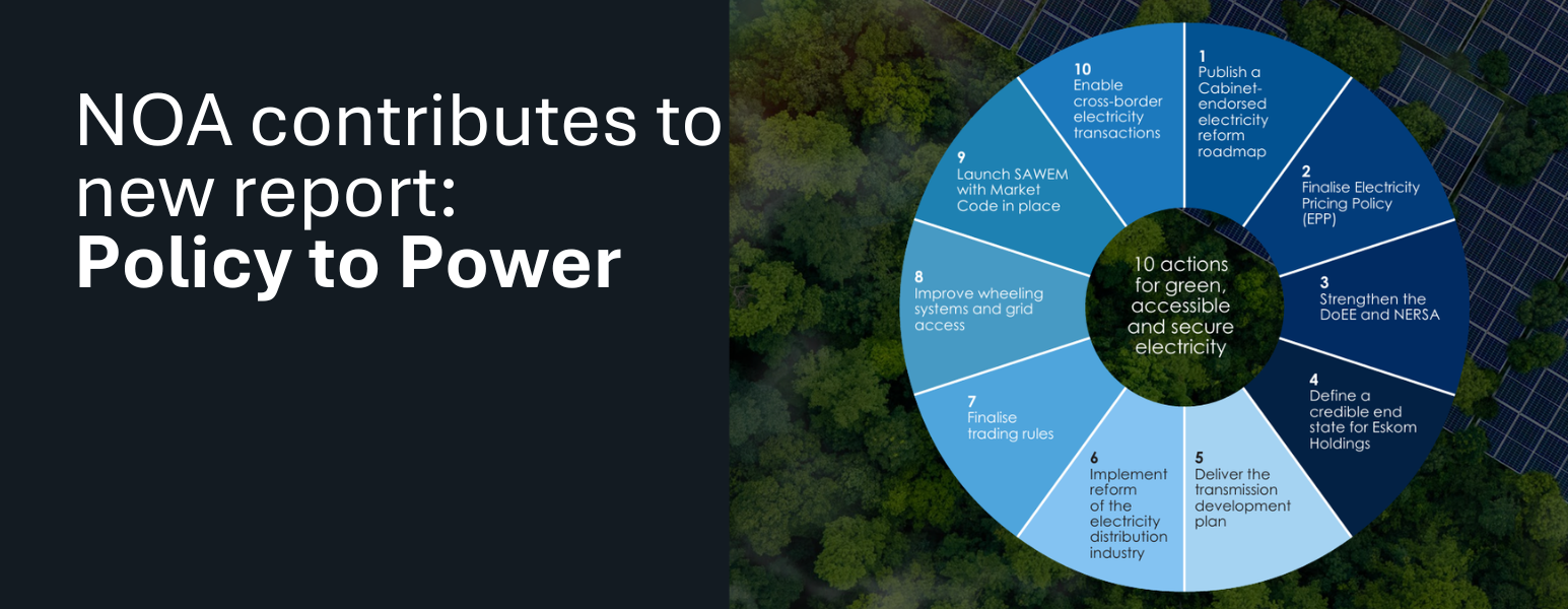 NOA actively participated in the design, development and release of a report named Policy to Power – Ten actions to deliver green, accessible and secure electricity, commissioned by the South Africa Electricity Traders Association (SAETA). NOA, together with several other members of SAETA, formed a working group to provide input into the positioning paper, that culminates in 10 actions that market reform needs. The ten recommended actions are practical, sequenced and widely supported.
